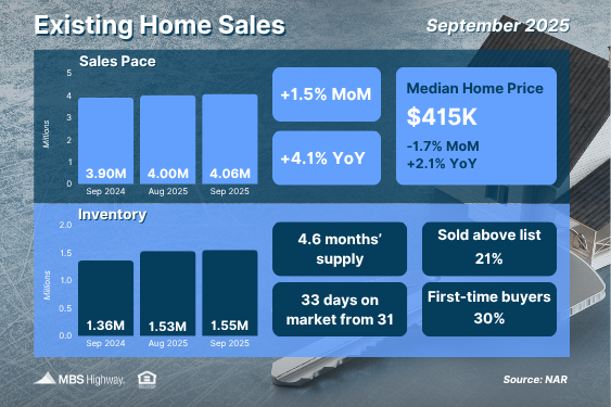 The National Association of REALTORS® (NAR) reported that existing home closings rose 1.5% from August to September, slightly below expectations but still 4.1% higher than a year ago. Inventory increased to 1.55 million units, matching a five-year high, though remaining below pre-COVID levels.