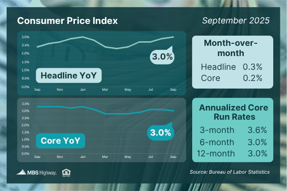 Inflation edged up modestly in September, with the Consumer Price Index (CPI) rising 0.3% for the month and 3% year-over-year – both slightly below forecasts. The increase was largely driven by higher energy costs, particularly gasoline prices, which jumped 4.1%.